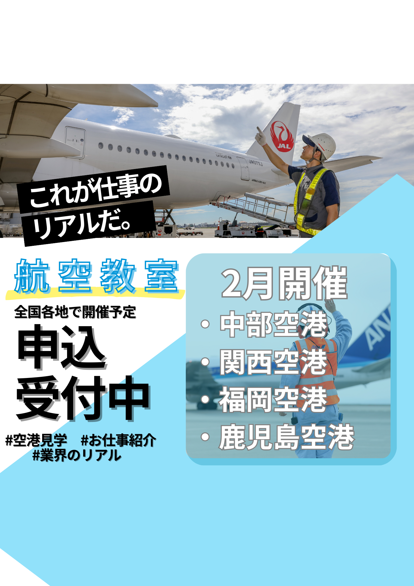 公益社団法人日本航空技術協会「航空整備士育成支援プログラム」について、 2026年4月入学者向けの募集が開始されましたのでお知らせします。 ◎制度概要 【対象者】 本校航空整備科に合格した方 【貸与額】 年間 最大50万円の無利子貸与 【その他】 貸付金は本校卒業後、株式会社JALエンジニアリング及びANAグループの航空機整備各社に 本人が入社し、国家資格取得など諸条件を満たした場合は、入社各社より本人に還付する予定です。 【奨学金の対象となる費用】 入学金、授業料、実習費等の学費 詳細は、日本航空技術協会HP内のこちらから内容をご確認ください。 【出願対象期間について】 奨学金の申請期間が2025 年10月1日(水)~2025年11月21日(金)協会必着となっております。 奨学金申請希望者は、本校の入学試験の11月期までに出願していただくよう、お願い致します。 ――――――――――――――――――――――――――――――― 本校にはANA・JALと連携したエアライン(ANA・JAL)整備士養成コースがあります。 またその他のコースからもANA・JALへの就職実績が多数あります。 エアライン(ANA・JAL)整備士養成コースの詳細はこちら ANA・JALでのインターンシップ生です。